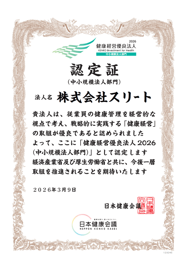 株式会社スリートは、このたび、従業員の健康管理について戦略的に取り組んでいる優良法人を認定する健康経営優良法人認定事務局より「健康経営優良法人2026(中小規模法人部門)認定証」を受領いたしました。